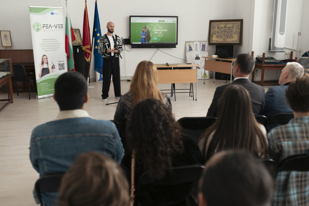 The program began with a presentation of the FEA-VEE project, delivered by the team of the Bulgarian Fashion Association. Attendees were introduced to the project’s mission and its role in developing a greener, circular and sustainable economic models in the textile, fashion and clothing industry. The discussion highlighted new opportunities for emerging designers to expand beyond local markets, collaborate across borders, and integrate sustainable practices into their creative processes.
